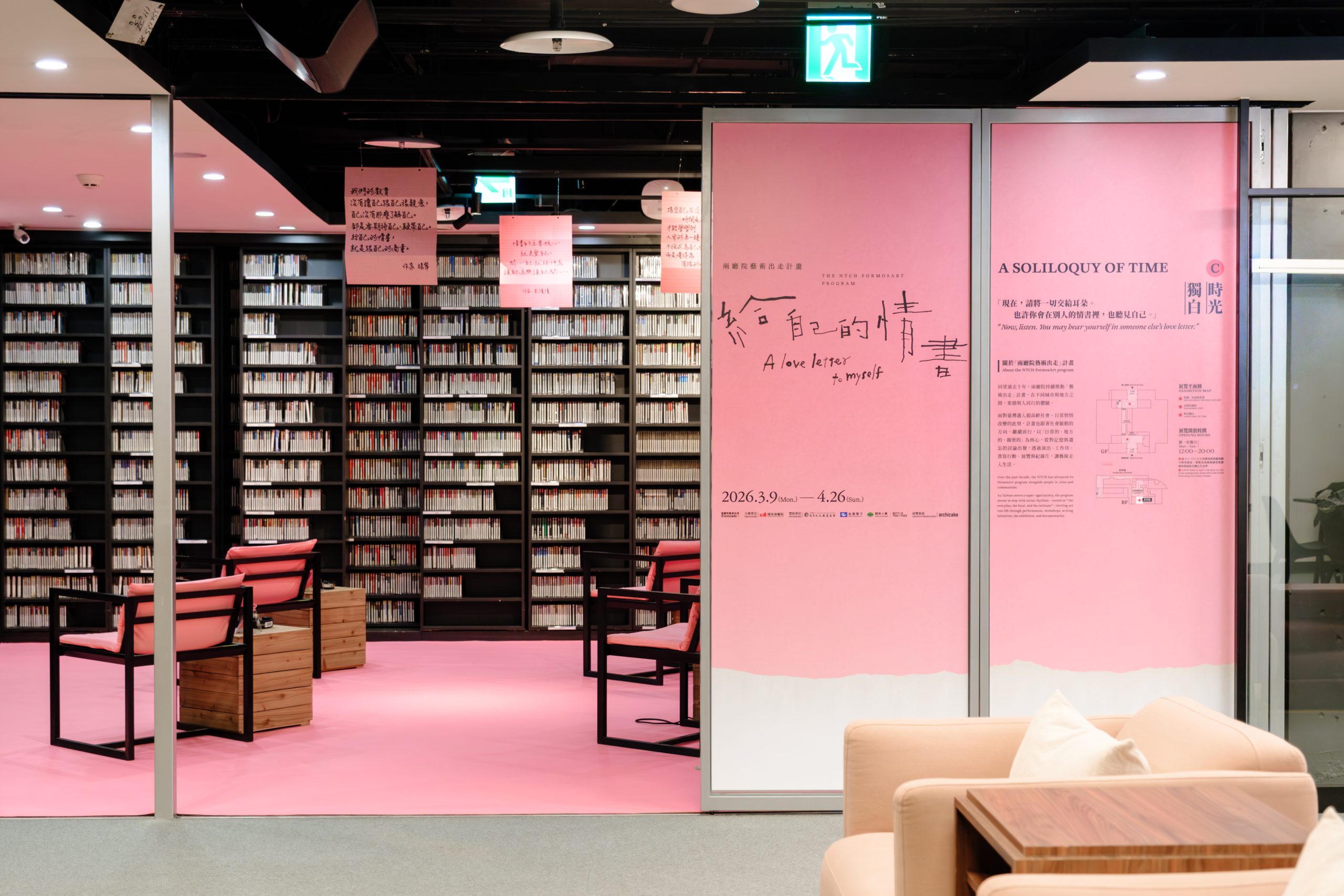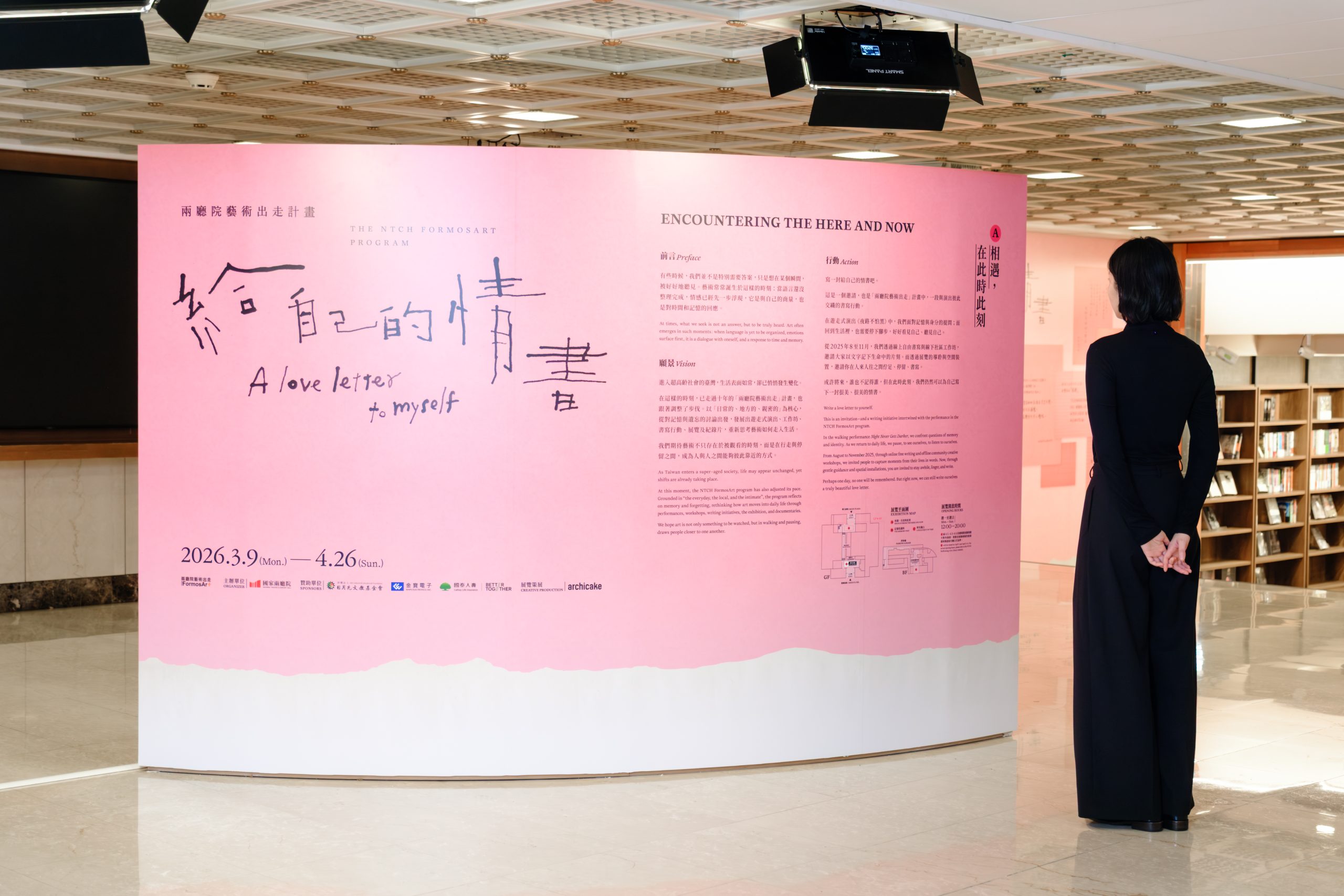 演出之外,兩廳院期盼計畫精神從舞臺走進日常,擴大公眾參與。「給自己的情書」展覽精選2025年書寫行動,由作家袁瓊瓊、楊翠及郭強生帶領參與者所創作的,有關記憶、情感與時間的真摯文字,並號召民眾以自身經驗理解超高齡議題帶來的挑戰,讓表演藝術領銜成為連結公共文化參與的重要媒介。3月9日起至4月26日於國家戲劇院 G 樓及兩廳院表演藝術圖書館開展。