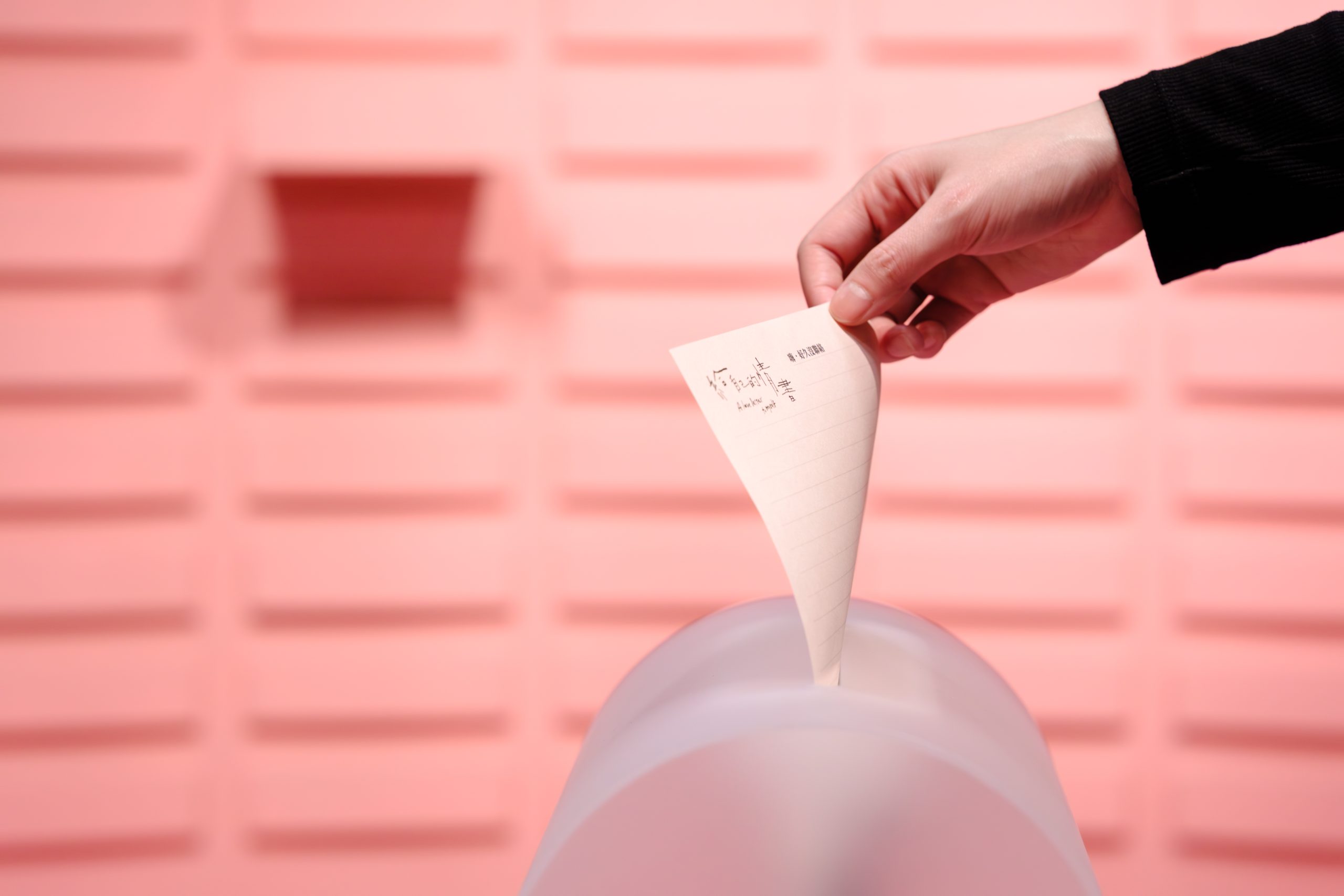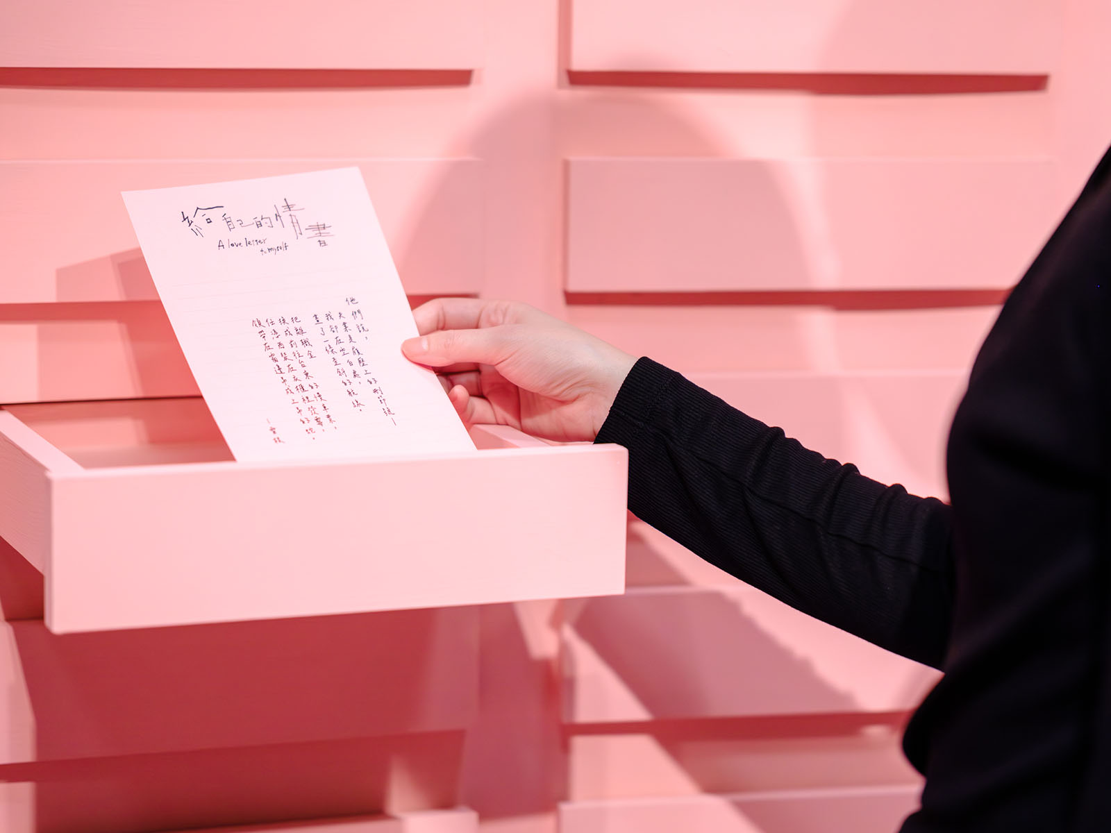 「記憶投遞所」展區,則邀請觀眾於現場寫下一封給自己的情書,並投遞至郵筒裝置,完成投遞後觀眾即可隨機獲得另一封情書,形成一次跨越時間與他人的情感交換。「給自己的情書」展覽回應「藝術出走 2.0」精神,讓書寫不只停留於個人的頁面之上,而是在仿若劇場這樣的公共空間中發生,企圖讓文字成為生命與藝術之間最真實的連結,從看見他人開始,亦能回望與關照自己。
