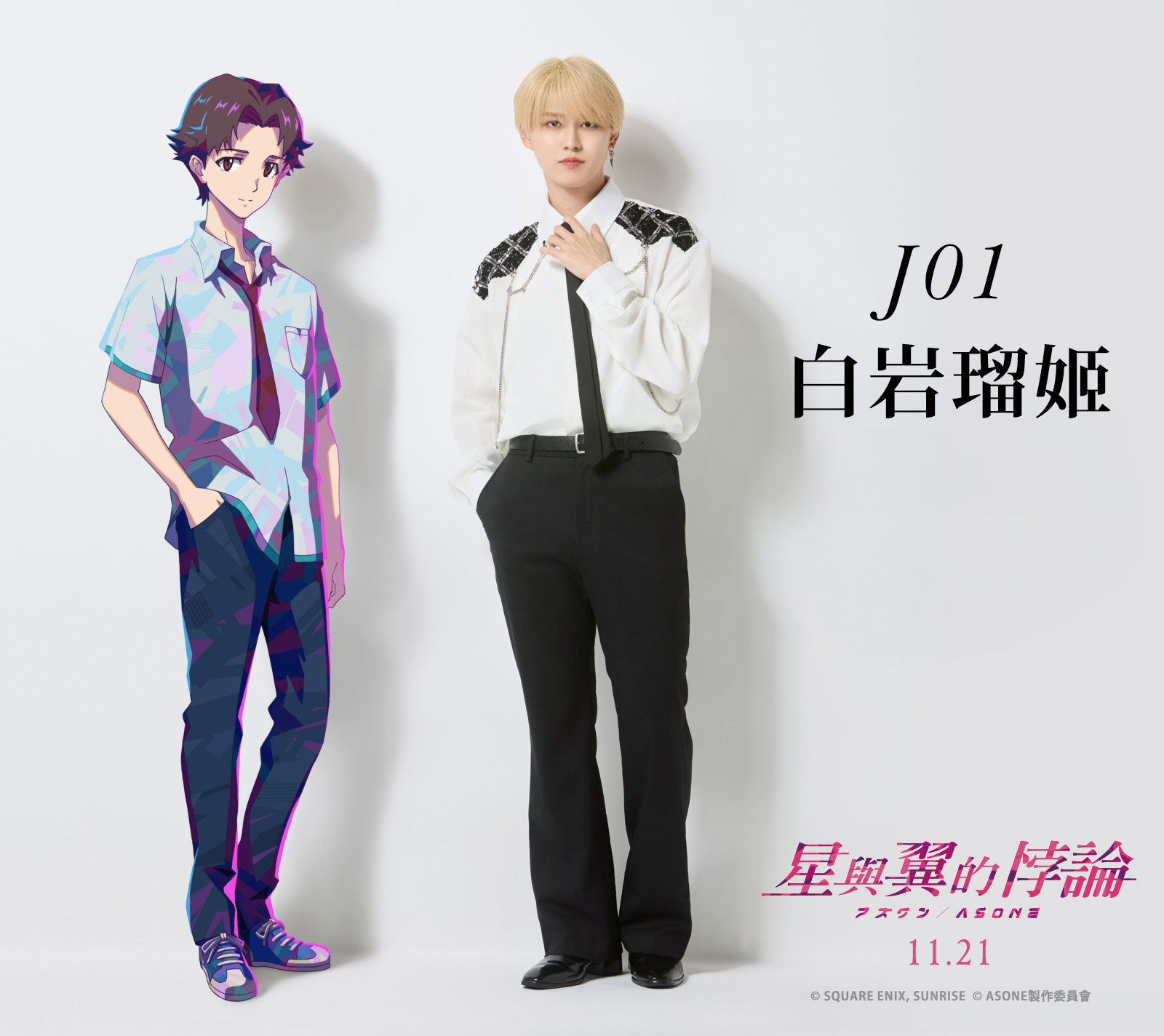 而在科幻鉅作電影《星與翼的悖論》中,對未來迷惘卻懷抱音樂夢想的高中生「陽」一角,由近來展現音樂與戲劇雙棲魅力的日本人氣男團「JO1」成員白岩瑠姬飾演,這不僅是他首度跨足電影圈並挑戰動畫聲優,更親自創作並演唱主題曲〈巡星〉,以溫柔細膩的歌聲詮釋角色對信念與羈絆的堅持,並用音樂道出角色內心成長,白岩瑠姬透露,〈巡星〉對他而言意義非凡,「陽是另一個我,對夢想懷抱不安仍努力往前。」