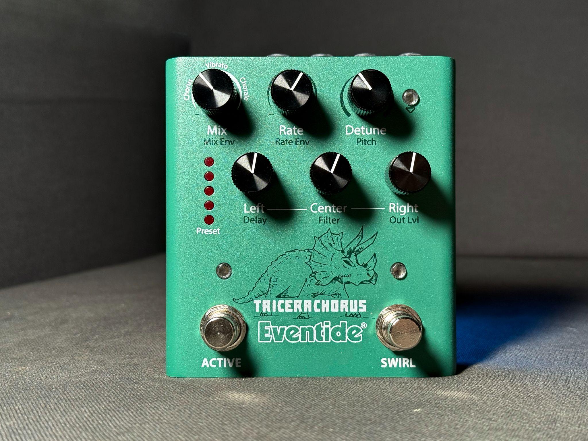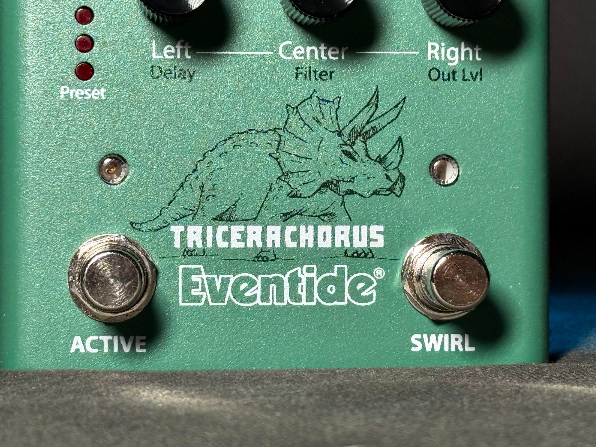 TriceraChorus 的三角龍塗裝明顯是臺灣人最愛的諧音哏,除了六個控制旋鈕外,也繼承了 Eventide 幾乎所有燈號都能按的傳統,提供單聲道輸入與雙聲道輸出功能,還提供單雙聲道輸出模式切換撥桿以及樂器與 Line Level 切換功能,讓不同樂器有更完整的發揮能力,效果器還支援表情踏板控制。