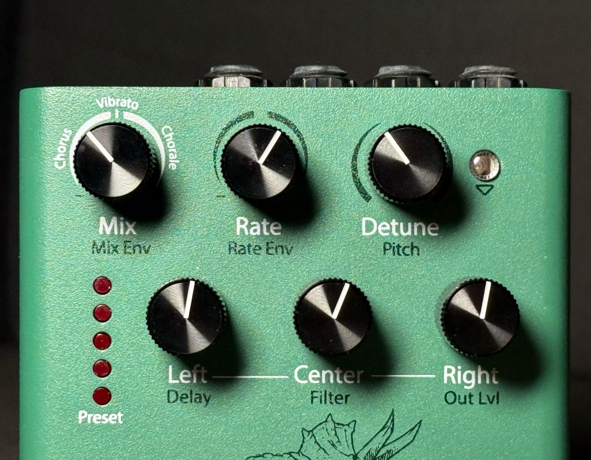 TriceraChorus 雖然只有六個旋鈕,但實際上它們都具備兩層控制功能,因此總共有12個參數控制,擁有可以在 Chorus、Vibrato、Chorale 三種效果間切換,以及控制效果速度的 Rate,還透過招牌的 MicroPitch 降音功能帶來更豐富的音色變化。效果器本身具備左、右、中三個獨立的 Chorus 效果,可以組合出不同於單一效果的豐富表現。此外,Swirl 踩釘還能為效果增添類 Univibe 的聲音效果。