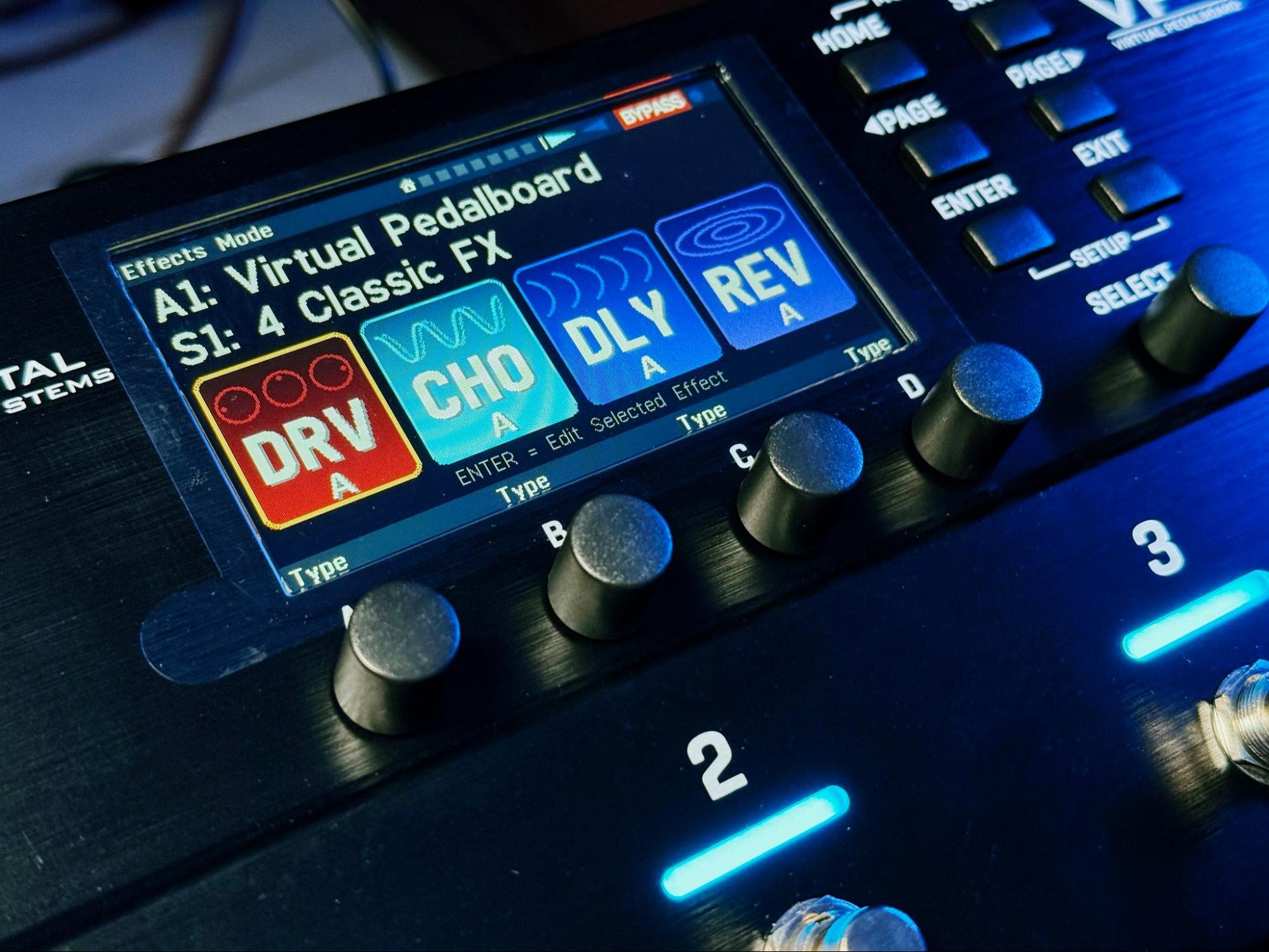 VP4 擁有超過400種效果,安置在 Drive、Delay、Reverb、Chorus 等等的主要類別中,個人初次操作時大約需要一個小時的適應期。它擁有效果(Effects)模式、場景(Scene)模式與預設(Preset)模式,在效果模式下,可以選擇四種效果排序使用,彷彿就是在一個效果器盤上安置、調整四顆效果器。特別的是,長踩對應的踩釘,還可以切換至同一大類中的其他效果器,因此盤子上其實同時擁有四種主要類別、共十六顆的效果器可以隨時切換。