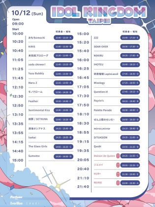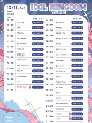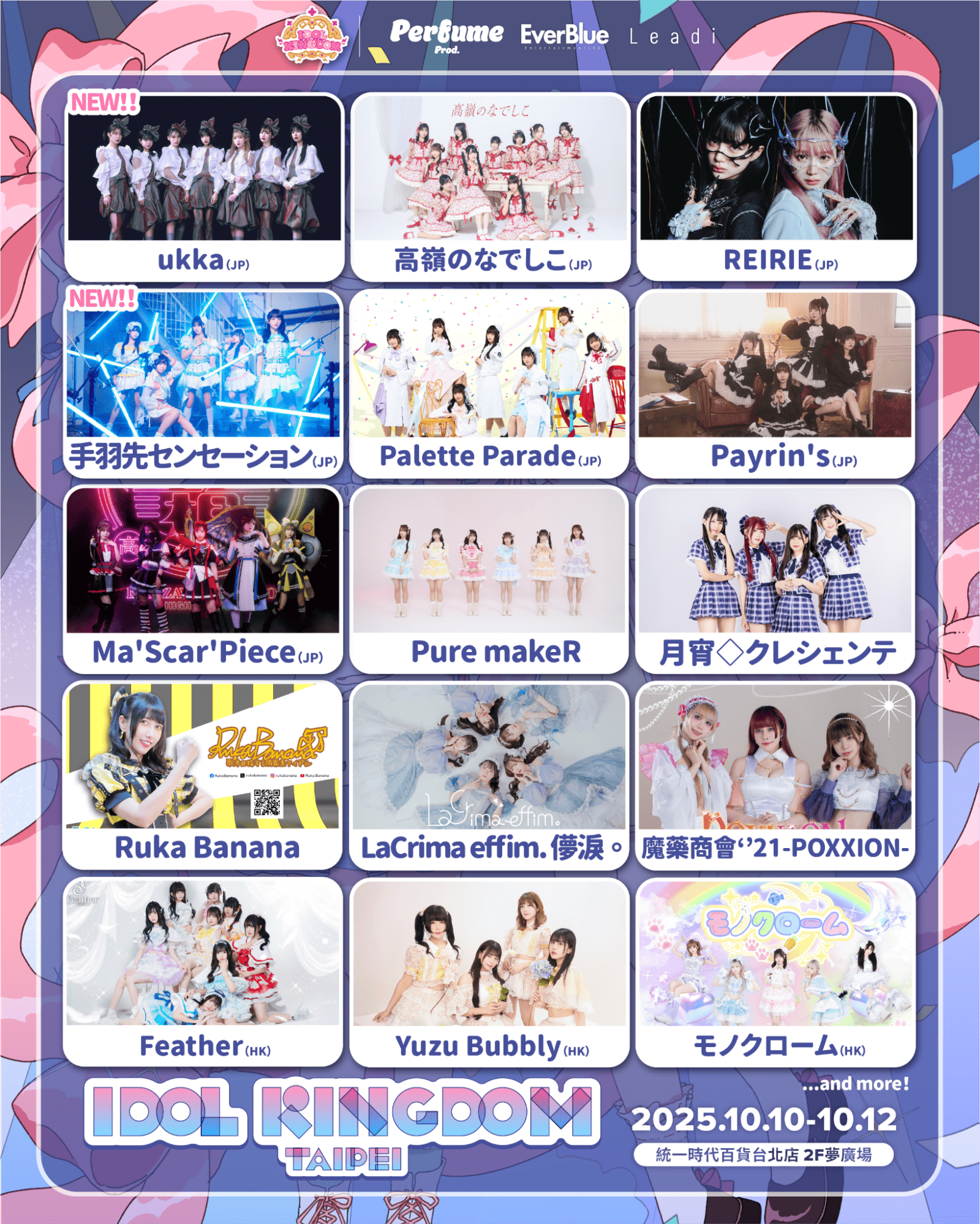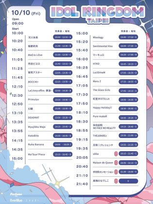 來自日本的人氣偶像音樂祭品牌「IDOL KINGDOM」將於今年秋天登陸臺灣,首次活動於10月10日至12日連續三天在統一時代百貨臺北店2F 夢廣場登場,集結超過60組來自日本、韓國、香港、上海、泰國與臺灣本地的女子偶像團體,打造一場屬於亞洲的偶像嘉年華。
