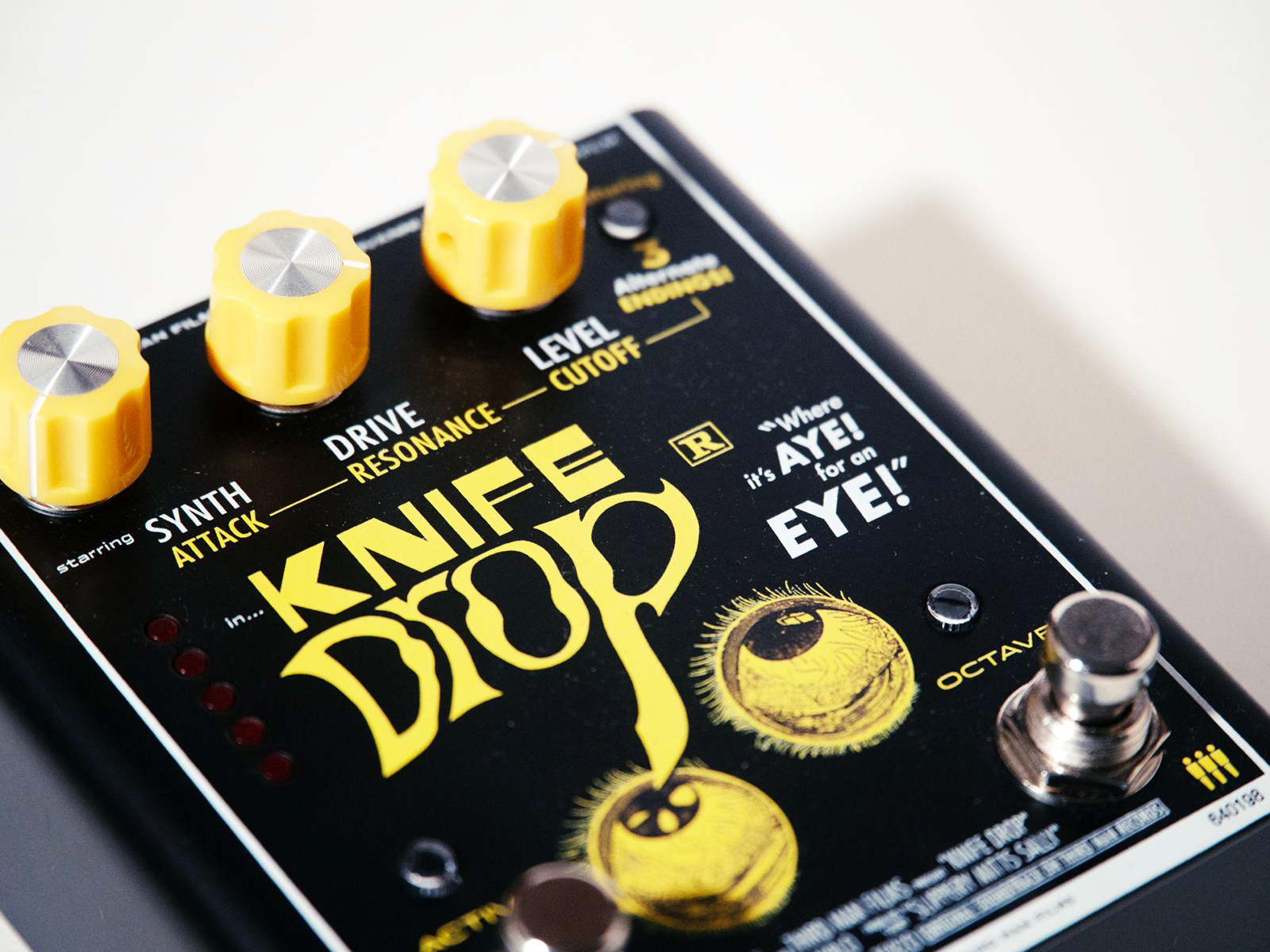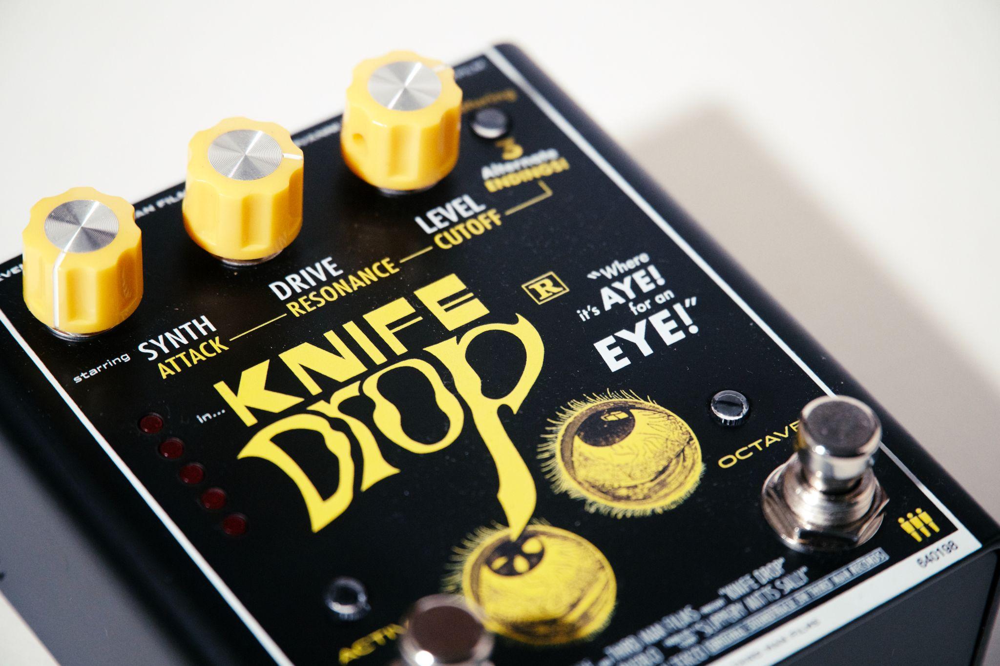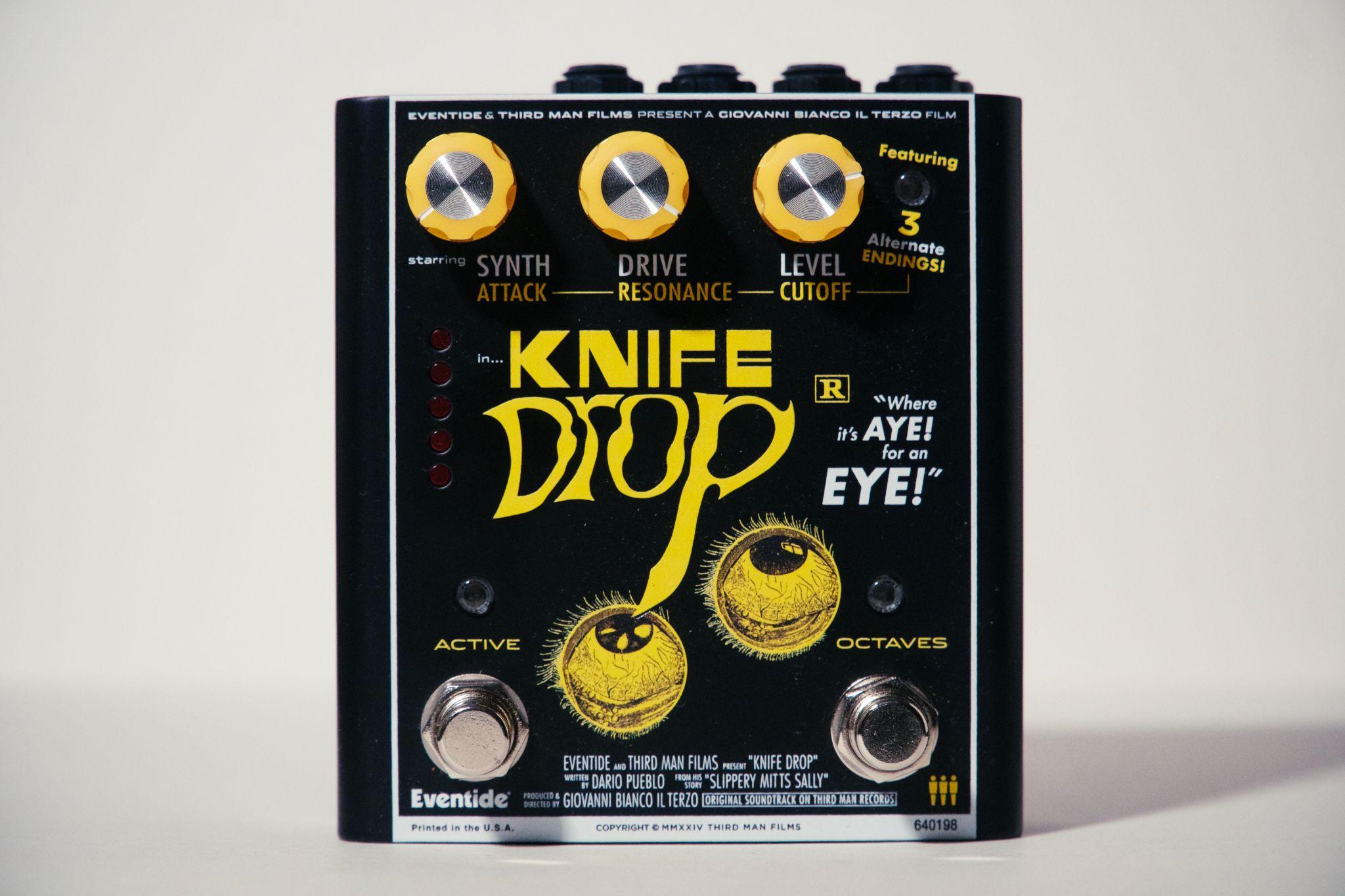 Knife Drop 是一顆 Octave Fuzz 與類比 Synthesizer 結合的效果器,機殼塗裝上可以看出致敬老恐怖電影海報的風格。相較 Eventide 其他單顆效果器六顆旋鈕的設計,Knife Drop 只有三顆旋鈕,但仍保留 Alternate 按鈕,讓每顆旋鈕都有兩種參數可以控制。輸入、輸出上,它也具備一個輸入與左右獨立輸出的設計,並配備表情踏板控制輸入與 USB 孔,樂手仍然可以透過 MIDI 進行控制,維持著 Eventide 品牌的一貫的使用邏輯。