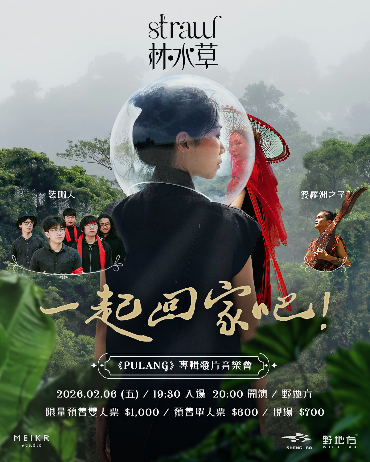 Straw 林水草的創作融合另類民謠與世界音樂元素,深受東南亞多元文化背景影響,長期透過多語創作書寫社會觀察與人文風景。本次演出延伸自2025年發行的專輯《Pulang》(馬來語「回家」之意),將其走訪五十多個國家的生命經驗,轉化為對「家」、「身分認同」與「社會議題」的深層探問。