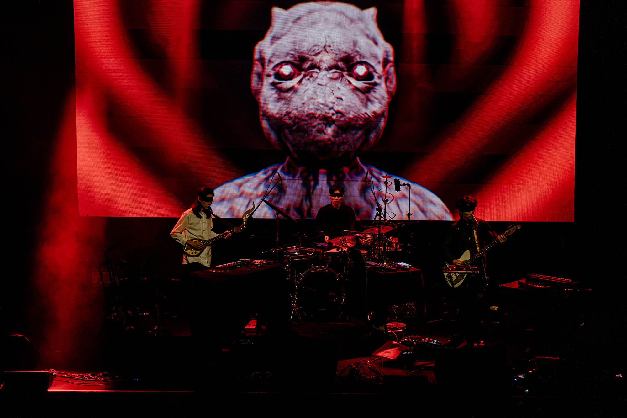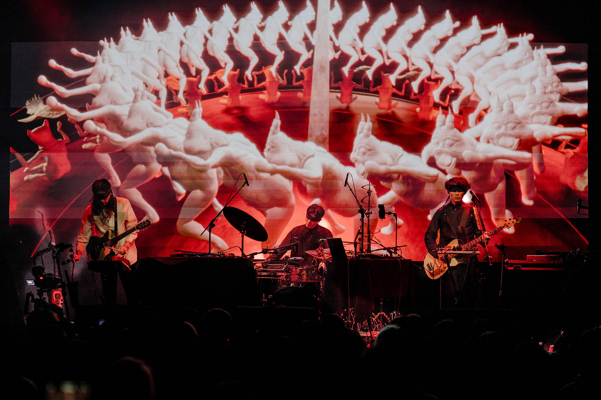 在面對即時影像生成的演出,真正的挑戰其實不在創作本身,而是「訊號」。邱晨恩坦言,每一個場域會遇到的干擾都不同,Wi-Fi、IEM 等訊號都有可能出狀況,「幾乎每一場都會遇到訊號問題,那我們就要想辦法用其他方式補回來。」因此,每一場演出都像是在「開盲盒」,永遠不知道當天會遇到什麼狀況。洪御說:「所以練團的目的,就是盡量降低開盲盒的機率。」