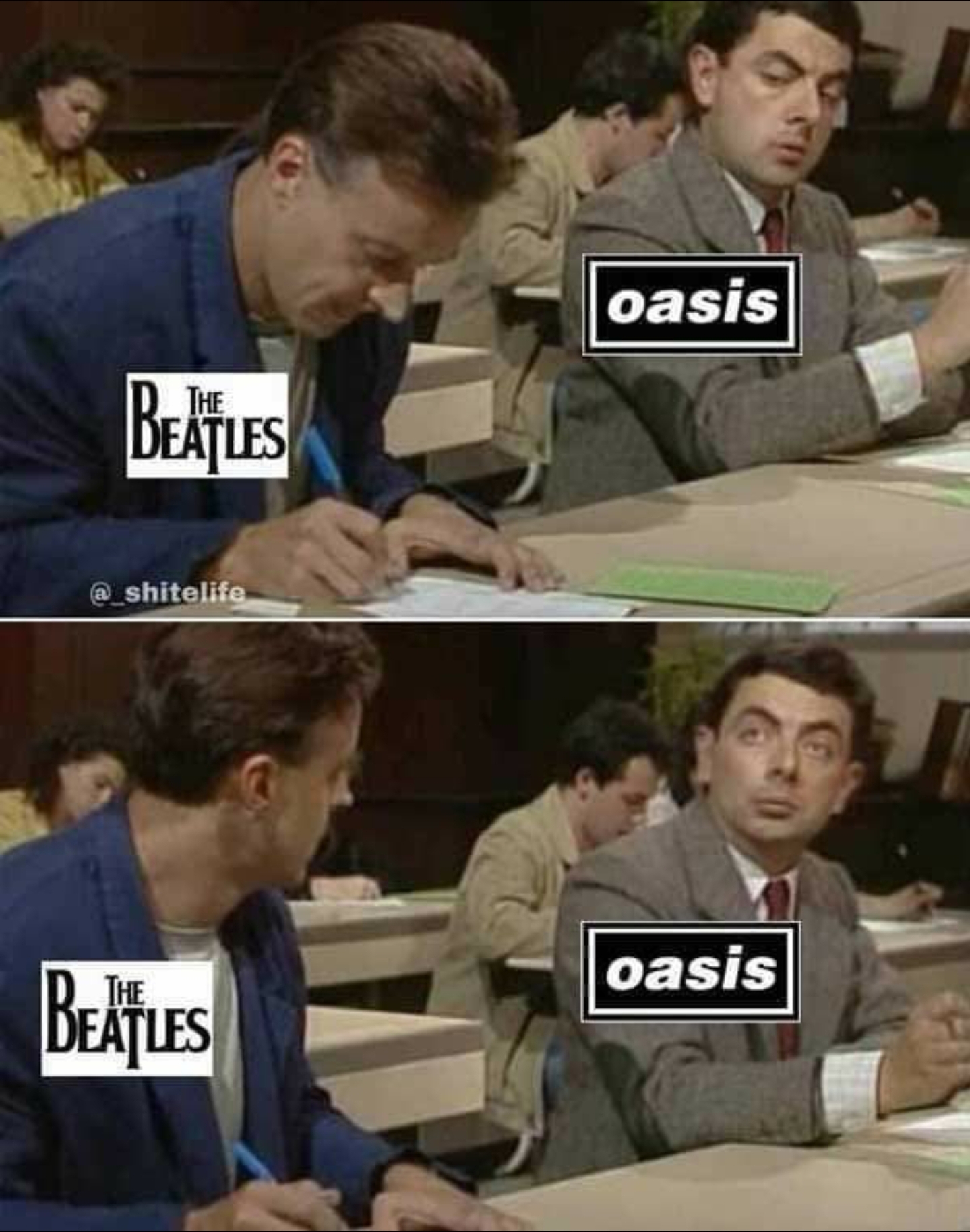 網路上常流傳一個迷因:一個人作弊偷看另一人的答案,前者的名字是 Oasis、後者則是 The Beatles(披頭四)──而 Gallagher 兄弟倆也沒在避諱這件事,Liam 坦言,收錄於第四張專輯《Standing on the Shoulder of Giants》中的〈Little James〉就是受〈Beautiful Boy〉和〈Hey Jude〉啟發;Noel 還曾說:「我們就是玩著 The Beatles 旋律的龐克樂團。」