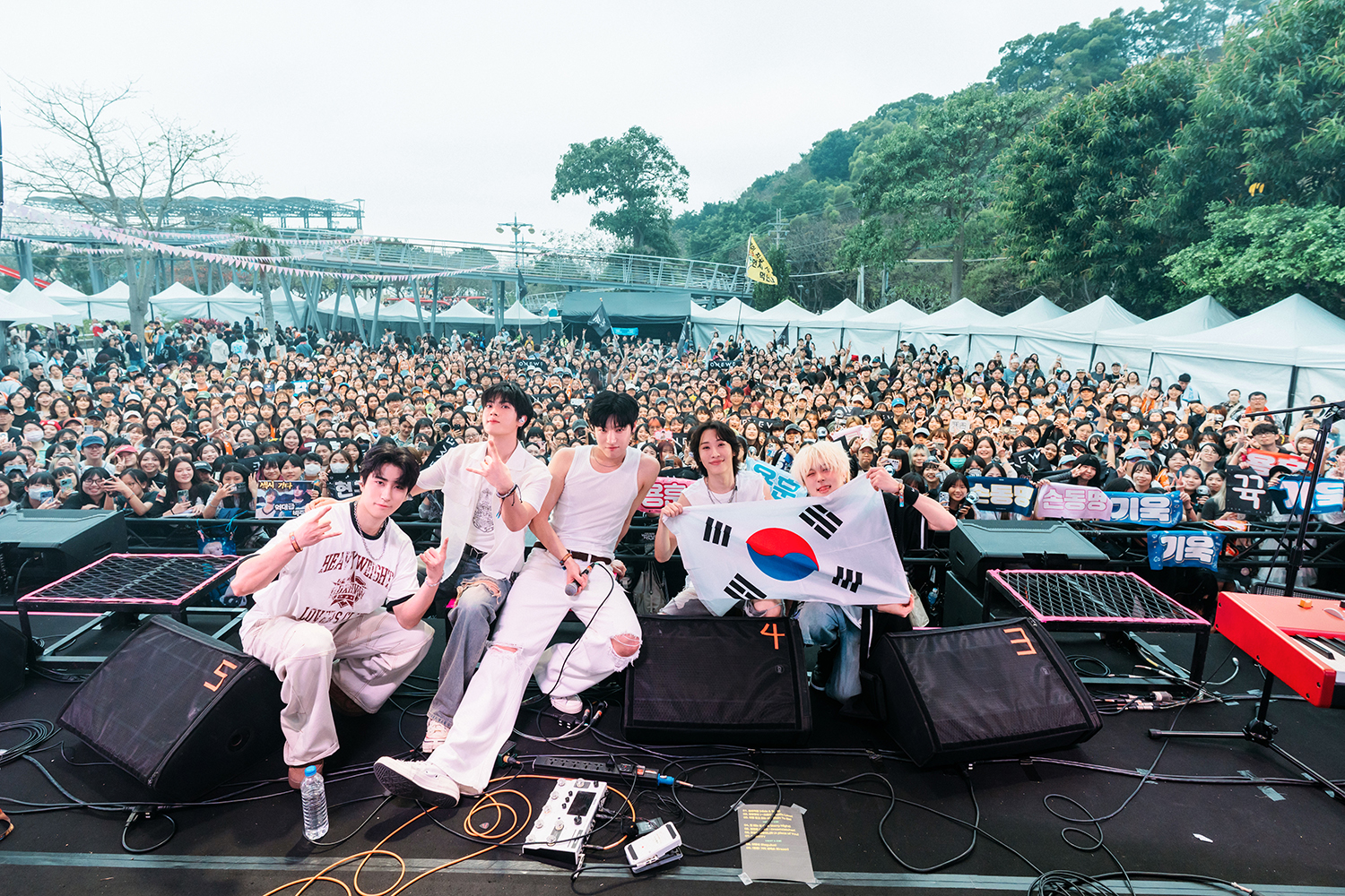 那天傍晚,「希望舞台」前的人潮不斷聚集,ONEWE 在一片歡呼聲中登上舞台,勇訓極具穿透力的嗓音、厦璘紮實有力的鼓擊,以及姜賢、基旭精彩的吉他、貝斯 solo,讓舞台能量層層堆疊;東明途中換上背在身上的 Keytar 走到前方與觀眾互動,基旭的 rap 段落再次抓住全場耳朵,台下粉絲整齊響亮的應援聲此起彼落。