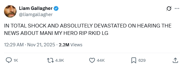 Mani 的離世撼動了整個英國搖滾樂壇,尤其是近期才剛宣布重組、正處於話題中心的 Oasis 兄弟。Liam Gallagher 在得知消息後,在 X 上心碎寫道:「聽到關於 Mani 的死訊,我幾乎是完全的震驚、徹底的崩潰。我的英雄,安息吧兄弟(RIP RKID)。」