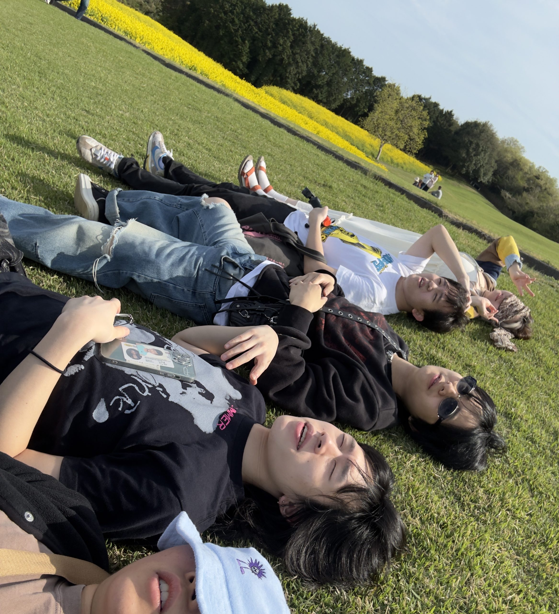 眾多音樂根源之中,他們不急於找出集合點,而是隨興分享、說玩就玩——他們也熱愛 cover 改編出自己的風格,例如近期就分享 The Sundays 名曲〈Here’s Where the Story Ends〉、Beyond〈早班火車〉,都是團員靈機一動,整隊火力支持。其中在〈Here’s Where the Story Ends〉的清新裡,豆腐王國注入他們標誌性的噪音風格,運用三把吉他製造多層次的聽感:「像是 Sam 負責以音牆營造氛圍,Rita 和 JK 則是 on top,加入一些我們想得到的 Riff。」